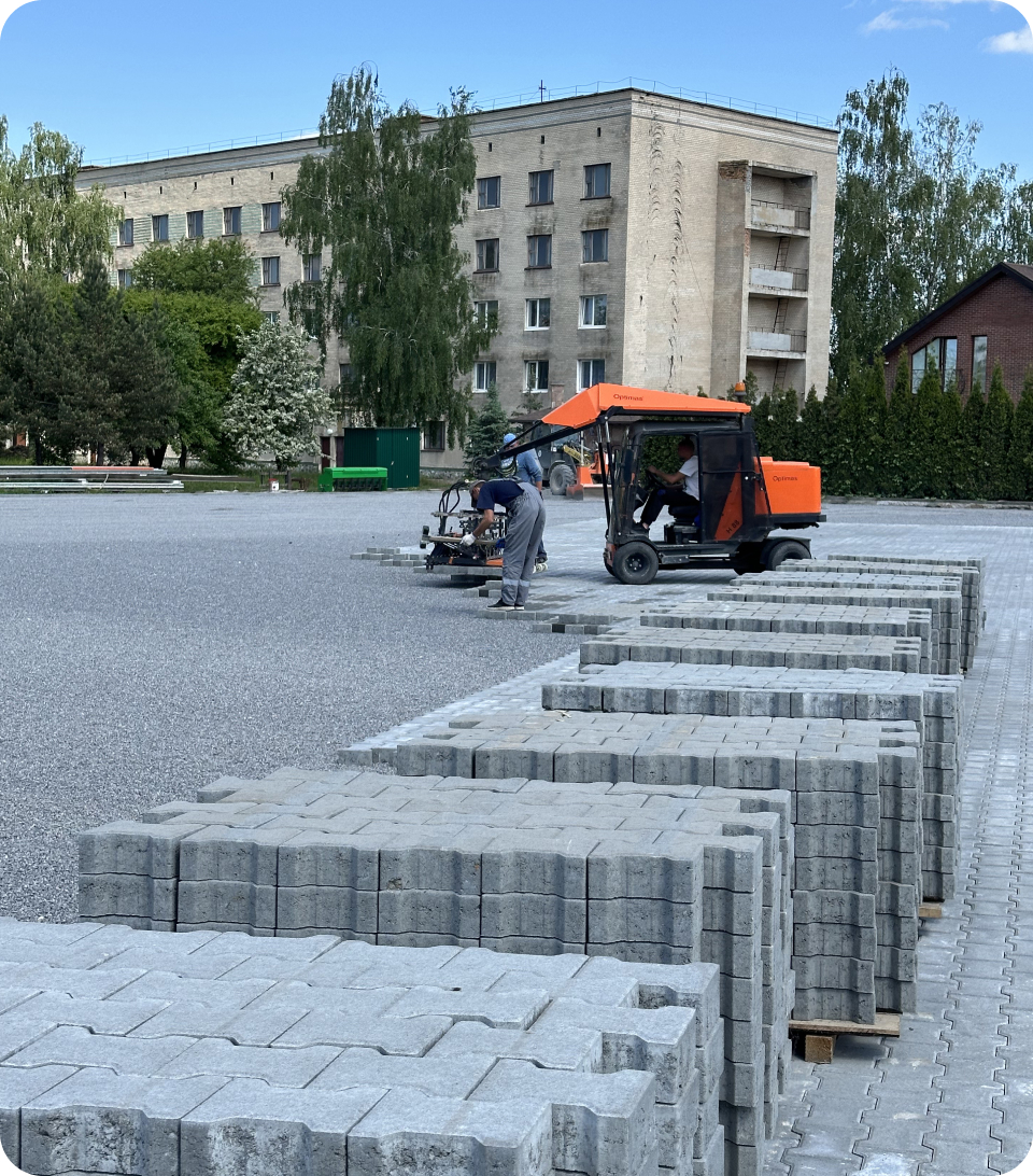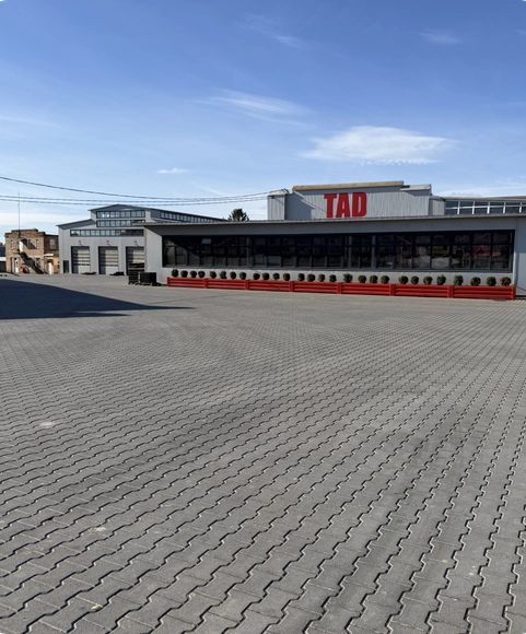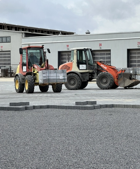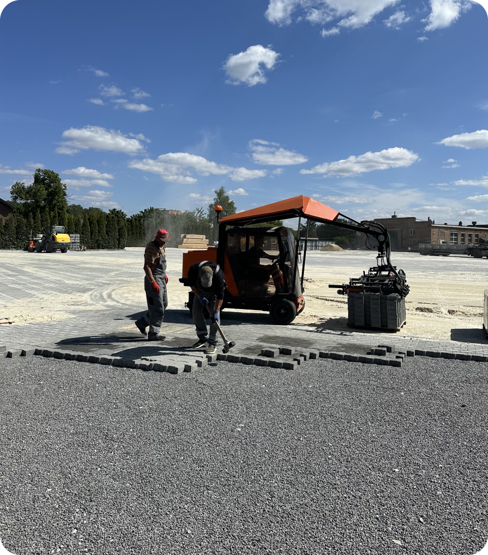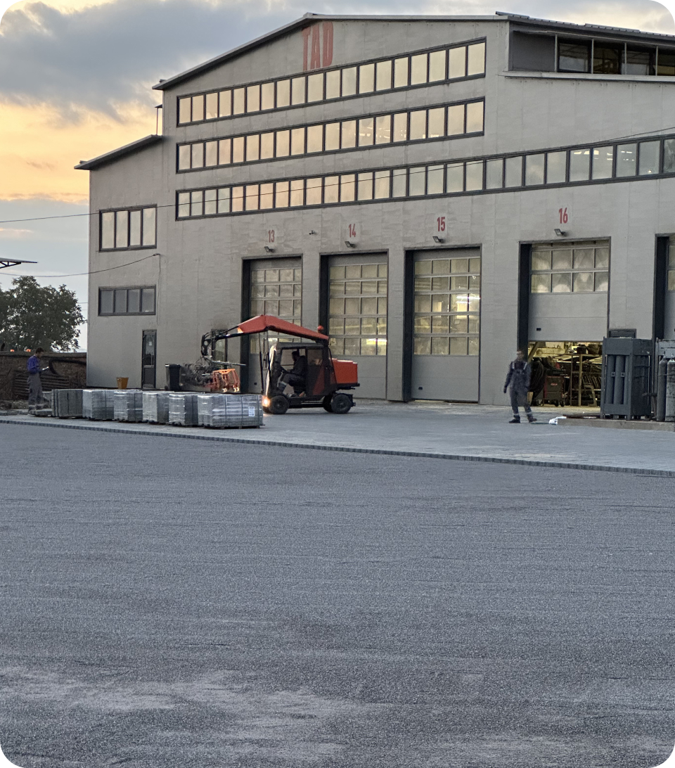 Для виробничо-транспортного підприємства “TAD” ми реалізували масштабний проект бруківки 28 000 м2, орієнтований на екстремальні навантаження. Оскільки бренд спеціалізується на виробництві причепів і напівпричепів (тралів, зерновозів) для негабаритних та агро-вантажів, територія має забезпечувати ідеально рівний проїзд та витримувати вагу багатотонних конструкцій без жодних просідань.